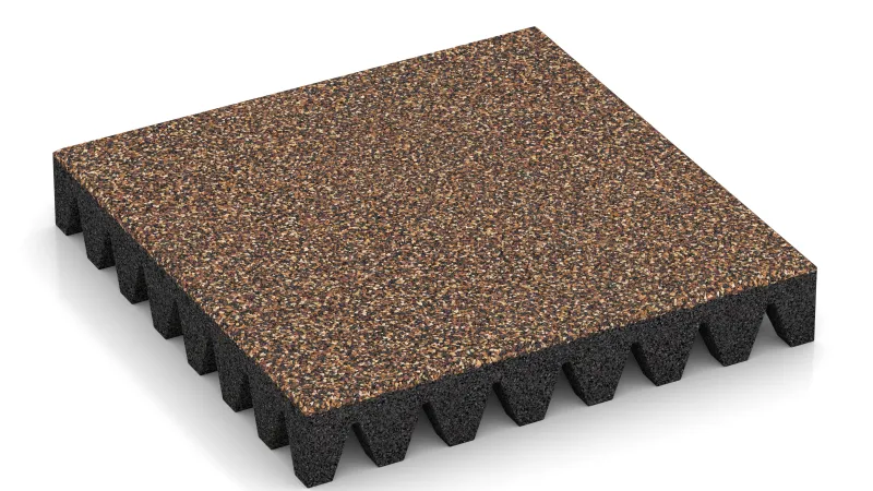 Die Platten bestehen aus PU-gebundenem Gummigranulat mit trittelastischer, griffiger Oberfläche. Dicke und Rohdichte bestimmen das Dämpfungsverhalten und damit die Fallhöhe nach EN 1177. Durch das 50 × 50 cm Raster bleiben Zuschnitte minimal, und Einzelplatten können bei Bedarf schnell getauscht werden.