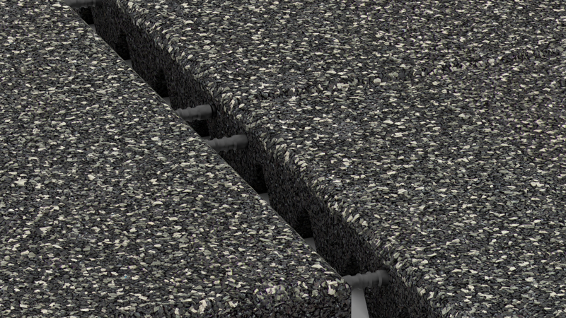 Zwei Plattenseiten verfügen über ein positives Zahnprofil, zwei über ein passendes negatives. Beim Verlegen greifen die Platten von unten formschlüssig ineinander und bilden eine dauerhafte, mechanisch sichere Verbindung. Von oben ergibt sich ein geschlossenes, fugenbündiges Erscheinungsbild mit gleichmäßiger Geometrie, das meist die Form eines klassischen Schachbrettmusters hat.