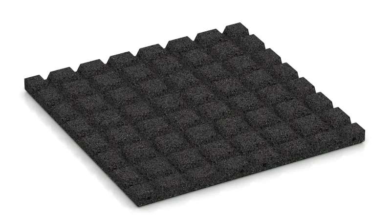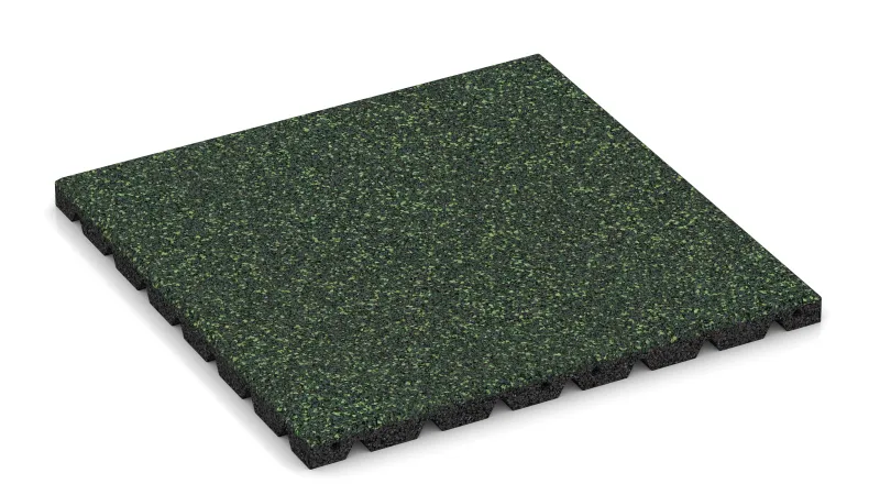 Die Platten bestehen aus PU-gebundenem Gummigranulat mit trittelastischer, griffiger Oberfläche. Dicke und Rohdichte bestimmen das Dämpfungsverhalten und damit die Fallhöhe nach EN 1177. Durch das 50 × 50 cm Raster bleiben Zuschnitte minimal, und Einzelplatten können bei Bedarf schnell getauscht werden.