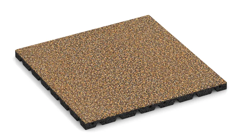 Die Platten bestehen aus PU-gebundenem Gummigranulat mit trittelastischer, griffiger Oberfläche. Dicke und Rohdichte bestimmen das Dämpfungsverhalten und damit die Fallhöhe nach EN 1177. Durch das 50 × 50 cm Raster bleiben Zuschnitte minimal, und Einzelplatten können bei Bedarf schnell getauscht werden.