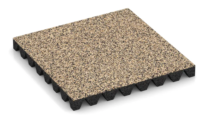 Die Platten bestehen aus PU-gebundenem Gummigranulat mit trittelastischer, griffiger Oberfläche. Dicke und Rohdichte bestimmen das Dämpfungsverhalten und damit die Fallhöhe nach EN 1177. Durch das 50 × 50 cm Raster bleiben Zuschnitte minimal, und Einzelplatten können bei Bedarf schnell getauscht werden.