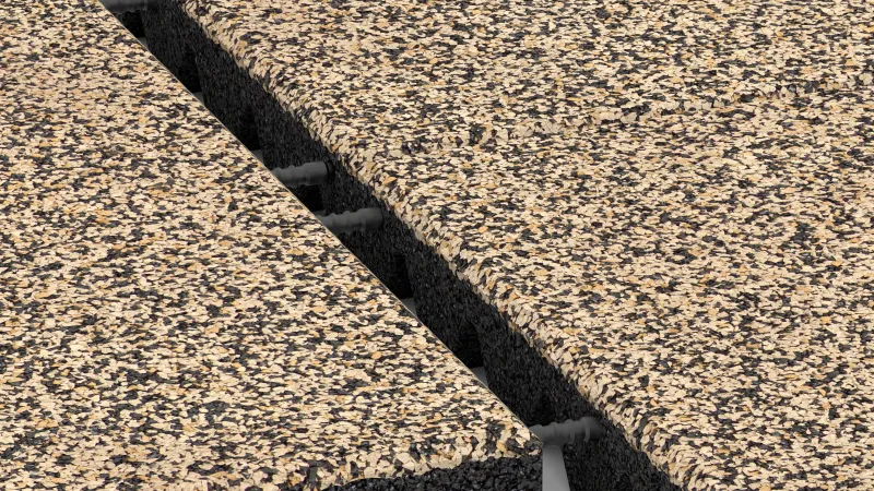Für den Außenbereich empfiehlt WARCO eine dauerhaft stabile, wasserdurchlässige Tragschicht. Bewährt haben sich Kunststoff-Wabengitter (Kiesgitter) oder ein vorhandener, gebundener und dränfähiger Unterbau wie etwa Drainbeton. Ist die Tragschicht nicht wasserdurchlässig, muss bei witterungsexponierten Flächen ein Gefälle von mindestens 1,5 % zur Entwässerung eingeplant werden. Eine Verlegung auf Schüttgütern wie Sand, Splitt oder Kies ist nicht zu empfehlen – sie verlagern sich unter elastischen Platten und führen zu Instabilität.
