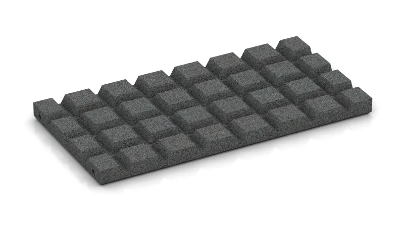 Die halbe Platte ist eine sinnvolle Ergänzung zur Gummigranulat-Platte Typ FS bei der Anlage von Flächen mit rasterkonformen Abmessungen (Länge und Breite jeweils als Vielfaches von 50 cm). Die Platten Typ FS müssen im Halbversatz und unter Zuhilfenahme von Streckverbindern verbaut werden. Das bedeutet also, dass jede zweite Reihe mit einer halben Platten beginnt und mit einer halben Platte endet.