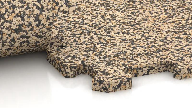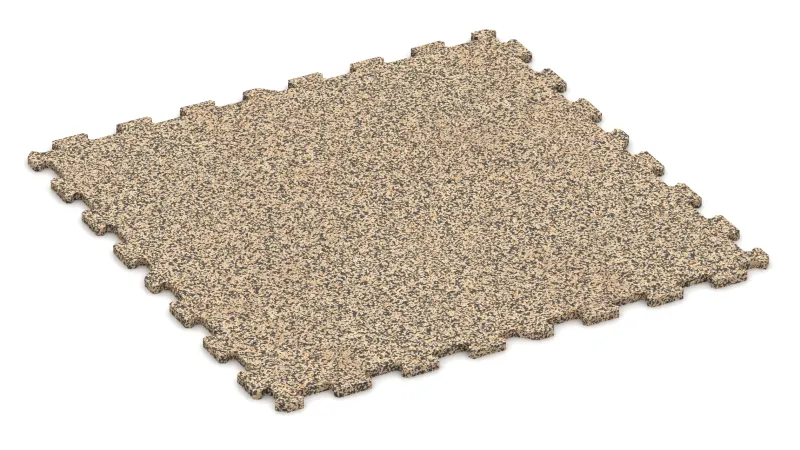 Die Treppenfliese wird aus PU-gebundenem Gummigranulat gefertigt. Zunächst werden großformatige Rohlinge gepresst und zum Ruhen gelagert. Nach einer definierten Reifezeit werden die Fliesen präzise aus den Rohlingen ausgeschnitten. So entstehen kalibrierte Treppenfliesen mit hoher Maßgenauigkeit und gleichmäßiger Oberfläche – ein klarer Vorteil bei Verlegung und Optik.